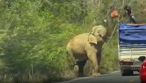 Mann auf Lkw wirft Dickhäuter Snack zu