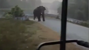 Dickhäuter schlecht gelaunt Wütender Elefant geht auf Safari-Truck los
