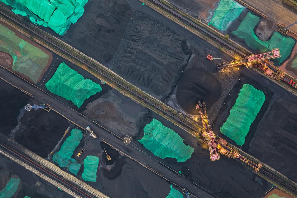 An einer Kohlelagerstätte am Ufer des Jangtse in Nanjing, in der östlichen chinesischen Provinz Jiangsu, wird die Kohle in Haufen sortiert.