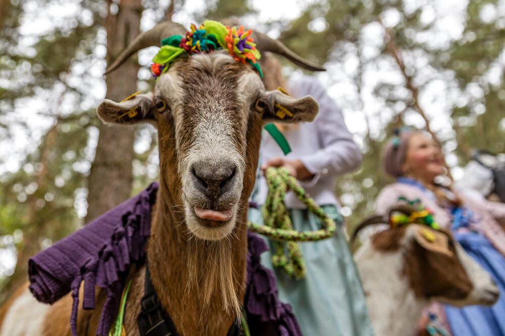 Eine Ziege steht bei der Vorbereitung auf den 25. Niederlausitzer Almabtrieb und streckt die Zunge heraus. Unter dem inoffiziellen Motto "ein Hauch Bayern im Flachland" wird hier ein Herbstfest gefeiert und zum Höhepunkt von der etwa 150 Meter hoch gelegenen Alm in Lieskau verschiedene Tiere herabgetrieben.