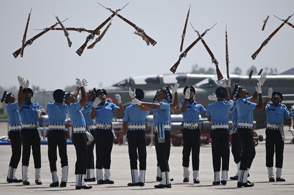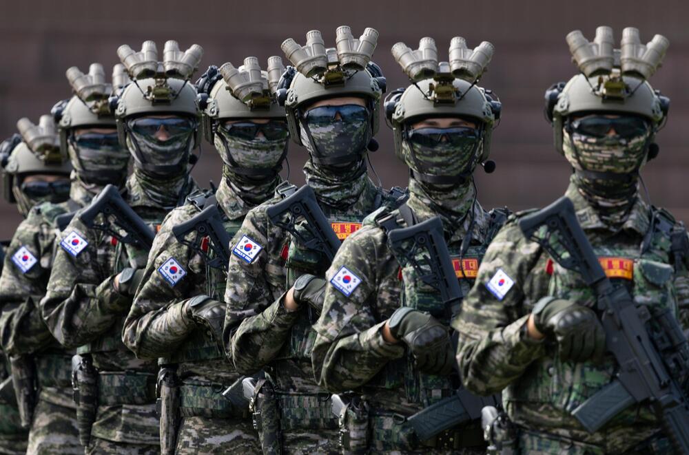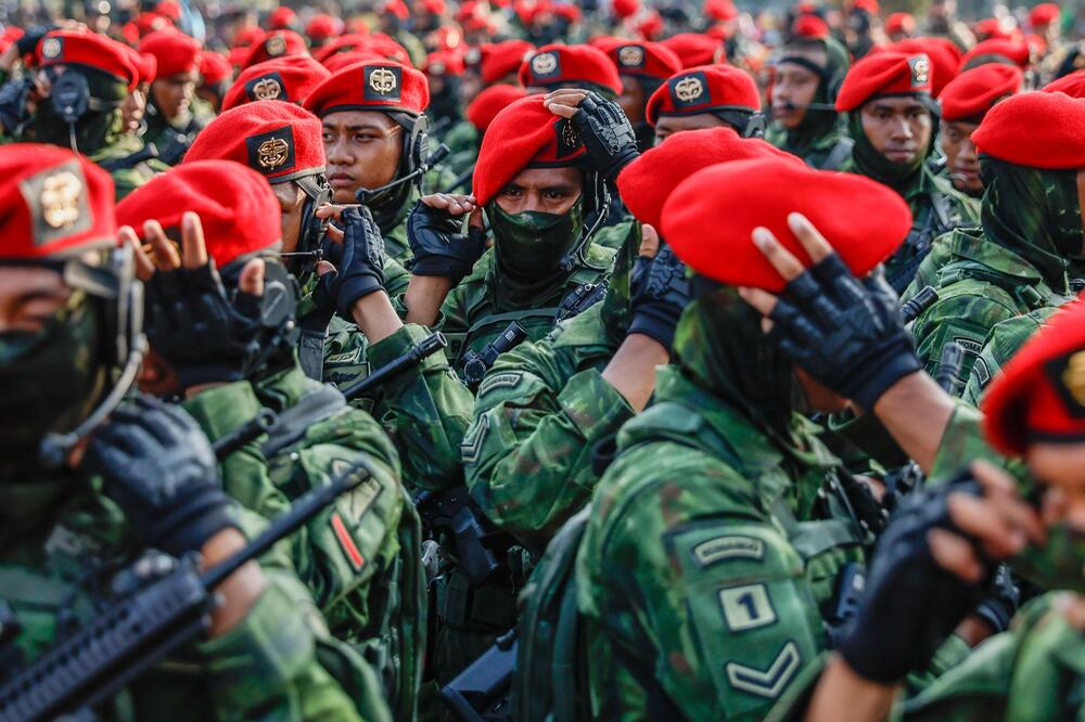Mitglieder der indonesischen Spezialeinheiten (Kopassus) bereiten sich auf eine Zeremonie zum 80. Jahrestag der indonesischen Streitkräfte am Nationaldenkmal (Monas) in Jakarta vor.