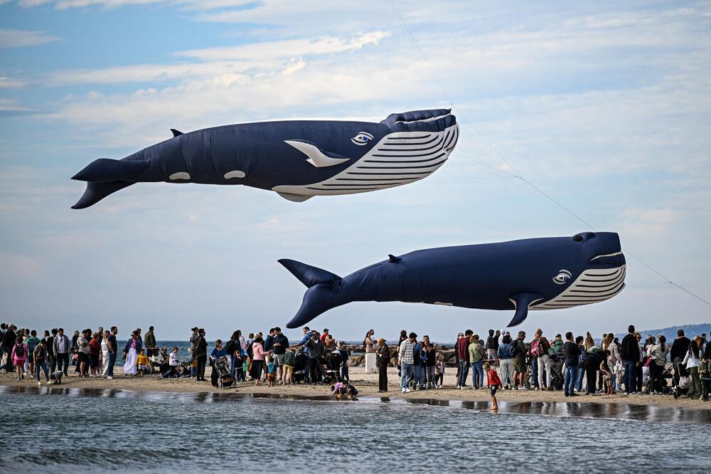 Besucher beobachten Drachenflieger beim Volovent Kite Festival in Palavas-les-Flots in der Nähe von Montpellier in Südfrankreich.