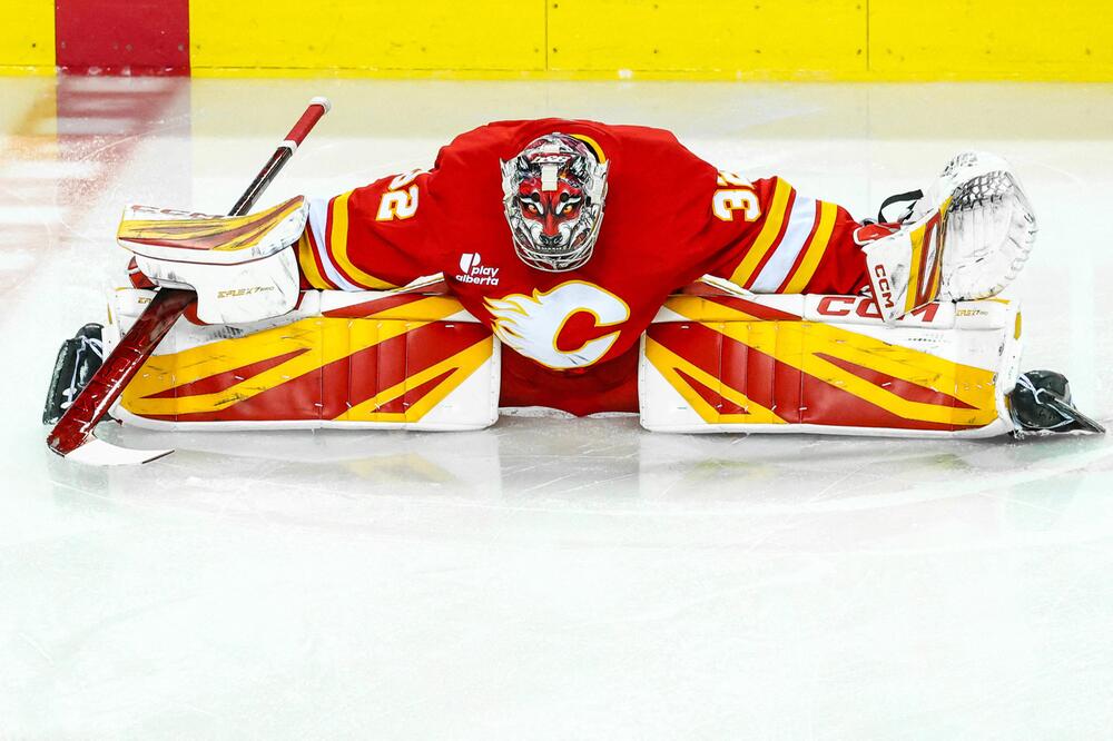 Calgary-Flames-Torhüter Dustin Wolf (32) dehnt sich während des Aufwärmens vor dem Spiel gegen die Winnipeg Jets im Scotiabank Saddledome.