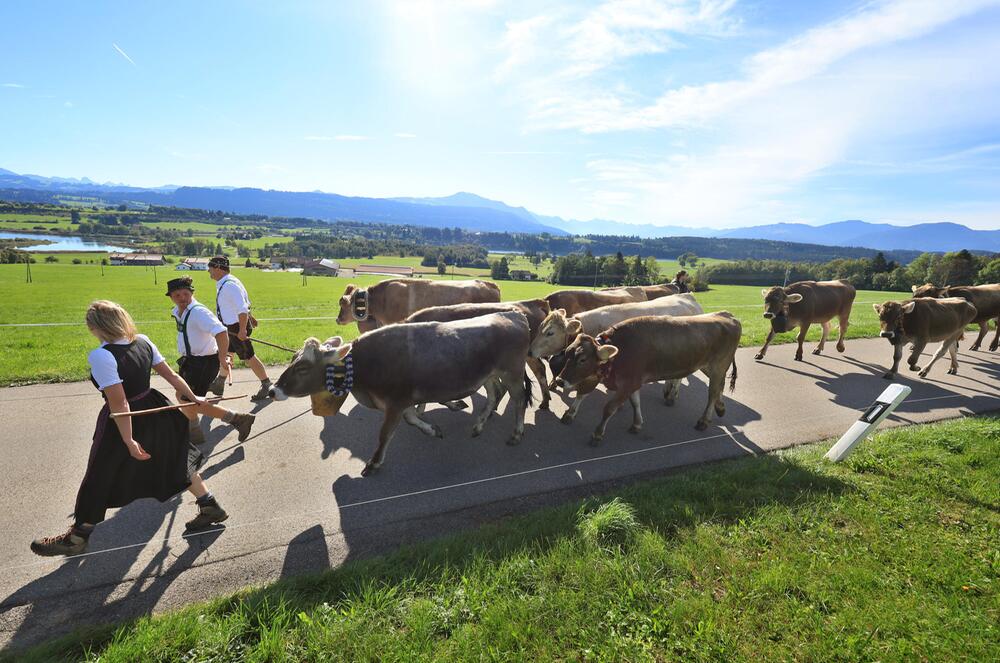 Hirten führen beim Viehscheid ihre Tiere von der Wachters Alpe in Richtung Tal zum Viehscheidplatz.