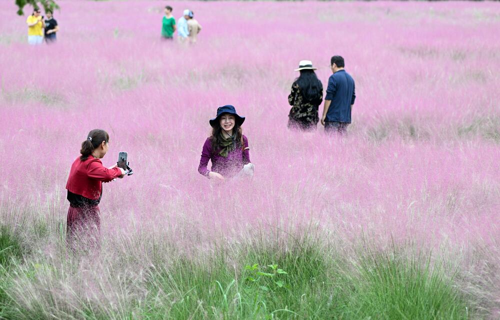 Touristen genießen die Herbstlandschaft zwischen dem rosa blühenden Haargras (Muhlenbergia capillaris) im Sanqiao Three Bridges Wetland Park.