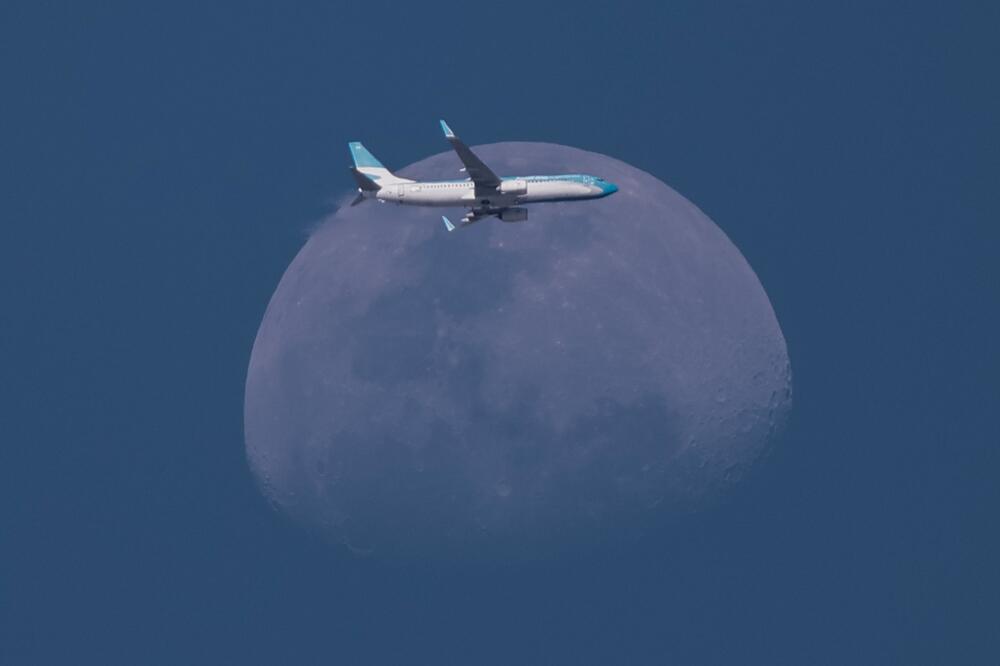 Ein Flugzeug zieht vor dem Hintergrund des Mondes über Banfield hinweg.