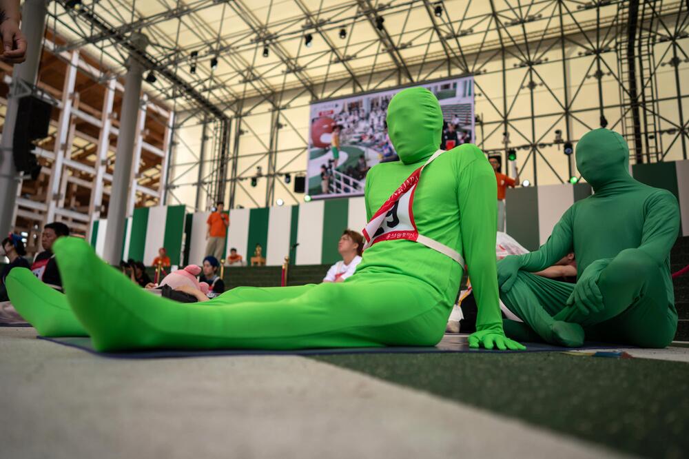 Angler nehmen trotz Regens an einem Angelwettbewerb am International Round Pond in Suqian in der Provinz Jiangsu teil.