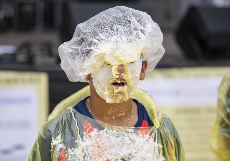 Am letzten Tag des zehntägigen Ganesh-Chaturthi-Festivals in Mumbai wird eine Statue des elefantenköpfigen Gottes Ganesha feierlich mit rotem Pulver bestreut.