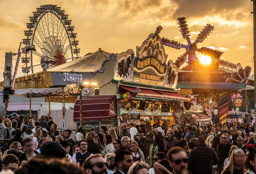 Wiesn-Besucher fahren in verschiedenen Fahrgeschäften auf dem 190. Münchner Oktoberfest an der Kulisse einen überdimensionalen Bierkrugs auf einem Bierzeltturm vorbei.