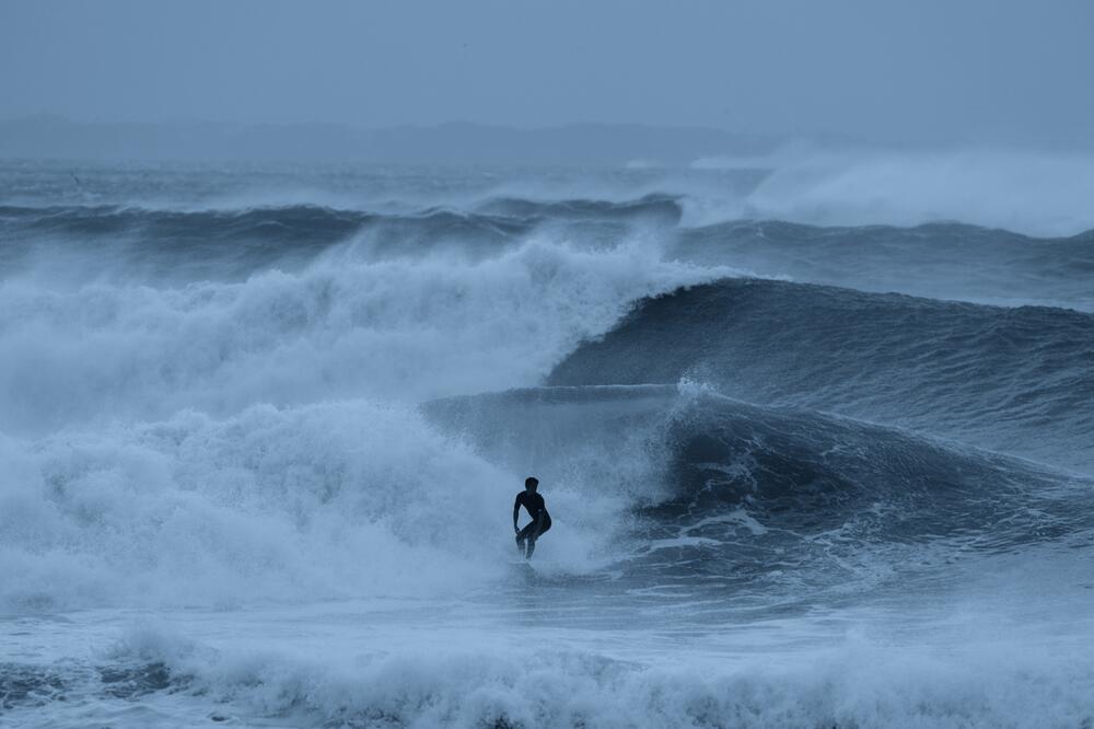 Ein Surfer trotzt den hohen Wellen, die Taifun Halong in Kamakura in der Präfektur Kanagawa ausgelöst hat. Die japanische Wetterbehörde gab Unwetterwarnungen heraus, während der als "Taifun Nr. 22" bekannte Sturm südlich von Tokio über den Pazifik zog.