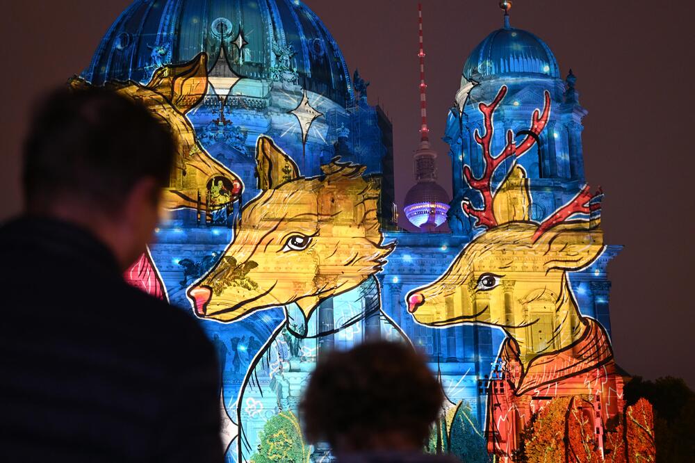 Zwei Personen stehen vor dem bunt beleuchteten Berliner Dom. Im Hintergrund ist der Fernsehturm zu sehen. Das 21. Festival of Lights steht unter dem Motto: "Let's shine together".