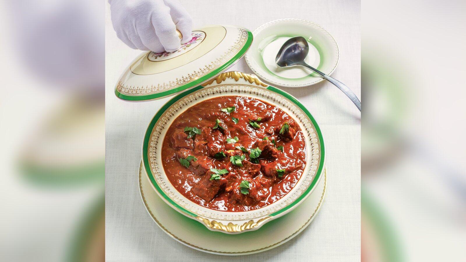 Zutaten für 4 - 6 Portionen: 900 g Gemüsezwiebeln, 50 g Butterschmalz oder Öl, 1 kg Rindfleisch (z. B. aus der Schulter), 3-4 Knoblauchzehen, 1 TL Kümmel, 2 EL edelsüßes Paprikapulver, 1 TL rosenscharfes Paprikapulver, 2 EL Tomatenmark, 2 EL Rotweinessig, 400 ml Fleischbrühe, 3 Lorbeerblätter, 2 Zweige Majoran, Salz, 1 Bund Petersilie
