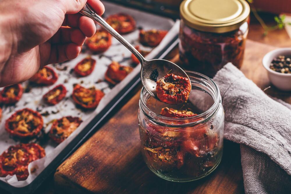 Stattdessen können Tomaten gewürfelt oder auch im Ganzen eingefroren und später für Soßen verwendet werden. Sie können sie aber auch trocknen und somit länger haltbar machen. Halbieren und entkernen Sie die Tomaten und trocknen Sie sie bei leicht geöffneter Tür rund 30 Minuten bei 50 Grad im Backofen. Die getrockneten Tomaten schmecken als Antipasti zu Käse oder als Zutat in Pastasaucen.