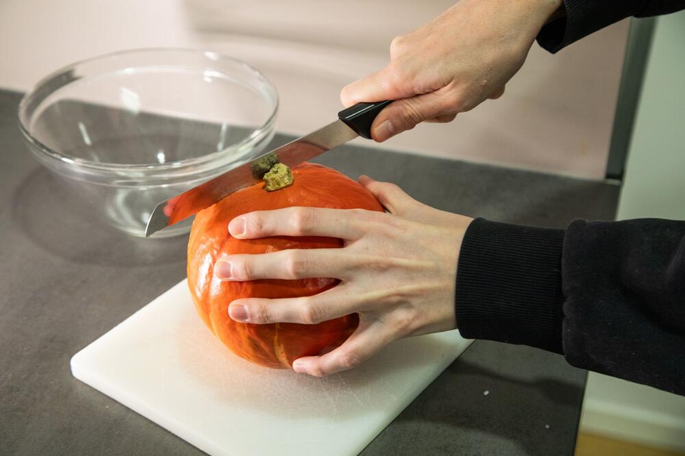 Doch lässt sich der erhitzte Kürbis nun auch wirklich leichter schneiden? Tatsächlich geht es mit dem Messer etwas einfacher, dennoch muss man noch Kraft aufwenden. An einigen Stellen ist der Kürbis auch bereits gegart – wer ihn also roh braucht, für den ist dieser Hack nichts.