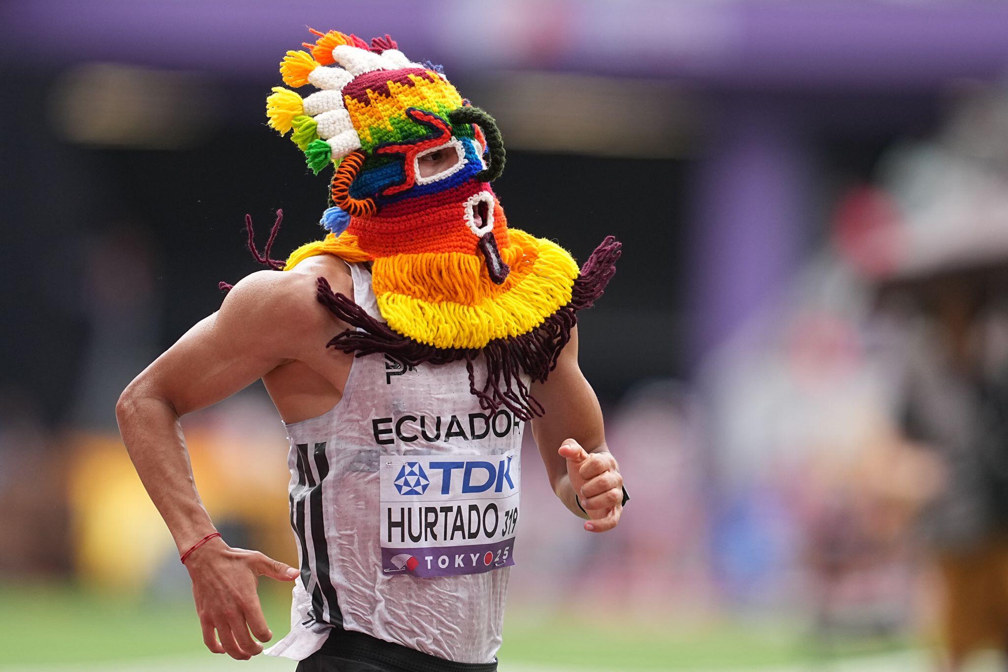 Der Ecuadorianer David Hurtado war der große Hingucker: Mit einer bunten Maske erreichte der Geher bei den Leichtathletik-Weltmeisterschaften nach 20 Kilometer das Ziel im Nationalstadion von Tokio - und zog so die Blicke auf sich. "Ich habe die Maske im Stadion für die paar letzten hundert Meter von meiner Physiotherapeutin bekommen", sagte Hurtado, der am vorletzten WM-Tag ein eigentlich unspektakuläres Rennen ging und 19. wurde.