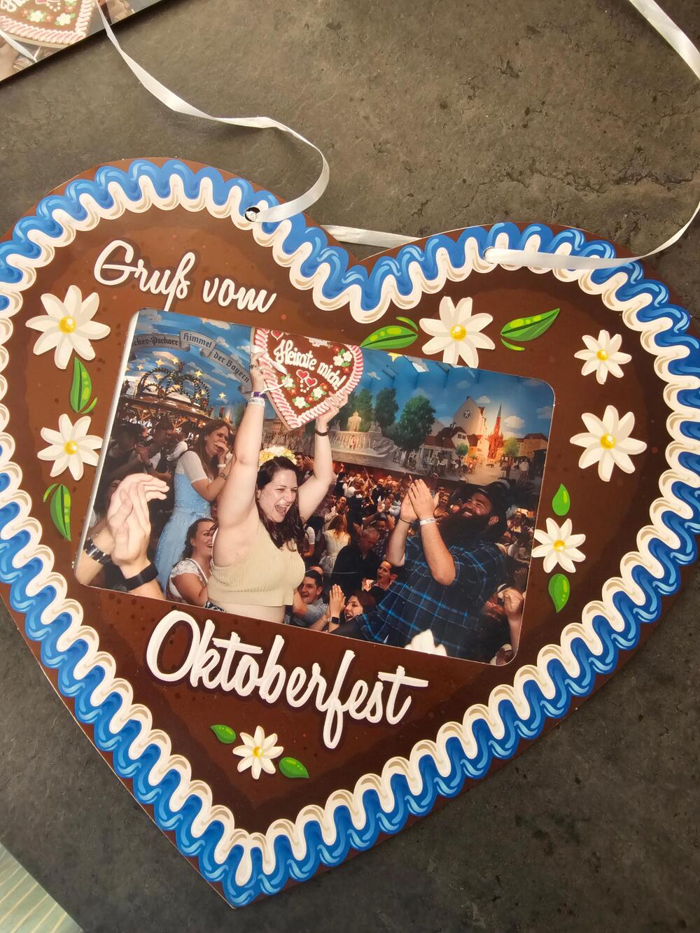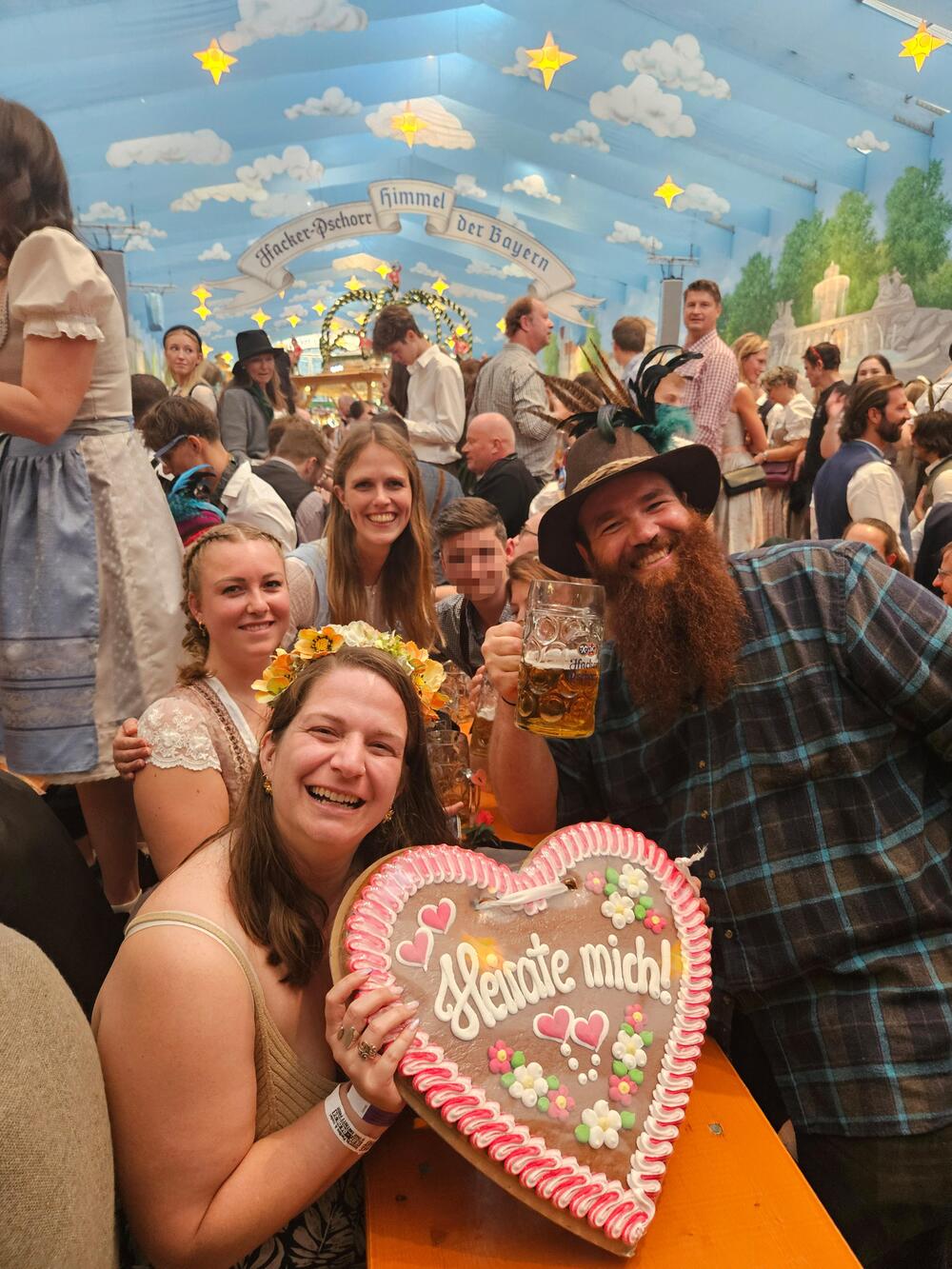 Eines Tages sind wir dann ins Hacker-Festzelt gegangen und haben uns zu euch (Anm. d. Red.: unserer Autorin und ihren Freunden) an den Tisch gesetzt und viel getrunken. Moran musste auf die Toilette und dann habt ihr mich gefragt, wo meine Frau ist. Ich habe gesagt, dass wir nicht verheiratet sind, aber dass ich gerne um ihre Hand anhalten würde, aber keinen Ring dabeihabe. Dann habt ihr mir vorgeschlagen, ein Lebkuchenherz mit der Aufschrift "Willst du mich heiraten?" beschriften zu lassen. Ich bin dann zum nächsten Lebkuchenstand gegangen und dort gab es sogar ein riesiges Herz mit der Aufschrift "Heirate mich!" zu kaufen. Ich kam zurück zum Tisch, ging auf die Knie und von da ging eine verrückte Party los. Circa 5.000 Menschen im Hacker-Festzelt sind ausgeflippt, alle haben applaudiert.