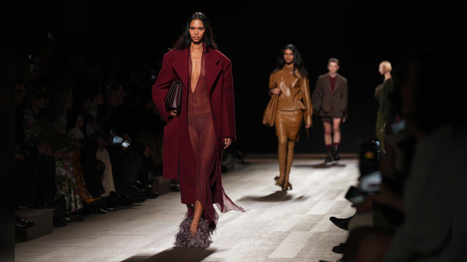 In den Herbst-/Winter-Kollektionen 2025 taucht der Ton auffällig oft auf: Khaite, Ferragamo, Saint Laurent und Max Mara setzen allesamt auf tiefes Bordeaux - mal in Form von fließenden Seidenkleidern, mal als strukturierte Lederpieces oder elegante Wollmäntel.