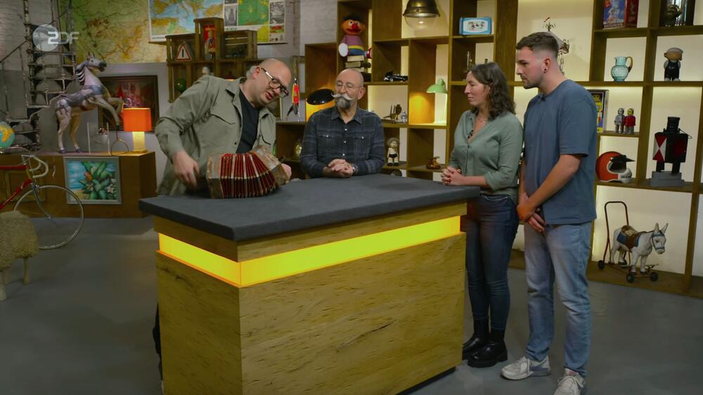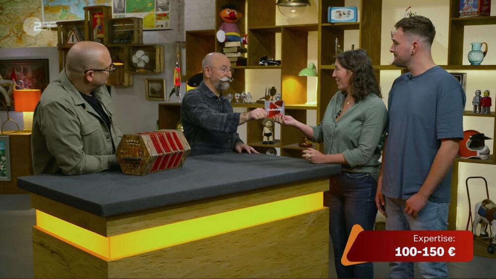 "Schwierig", raunt Deutschmanek. Regional, also in Sachsen, "könnte man noch mehr verlangen", glaubt der Experte. Aber "realistisch eingeschätzt" ist die alte Ziehharmonika nur 100 bis 150 Euro wert. Die beiden Geschwister nehmen die Händlerkarte dennoch an. Und im Händlerraum findet sich tatsächlich jemand, der das Instrument spielen will ...