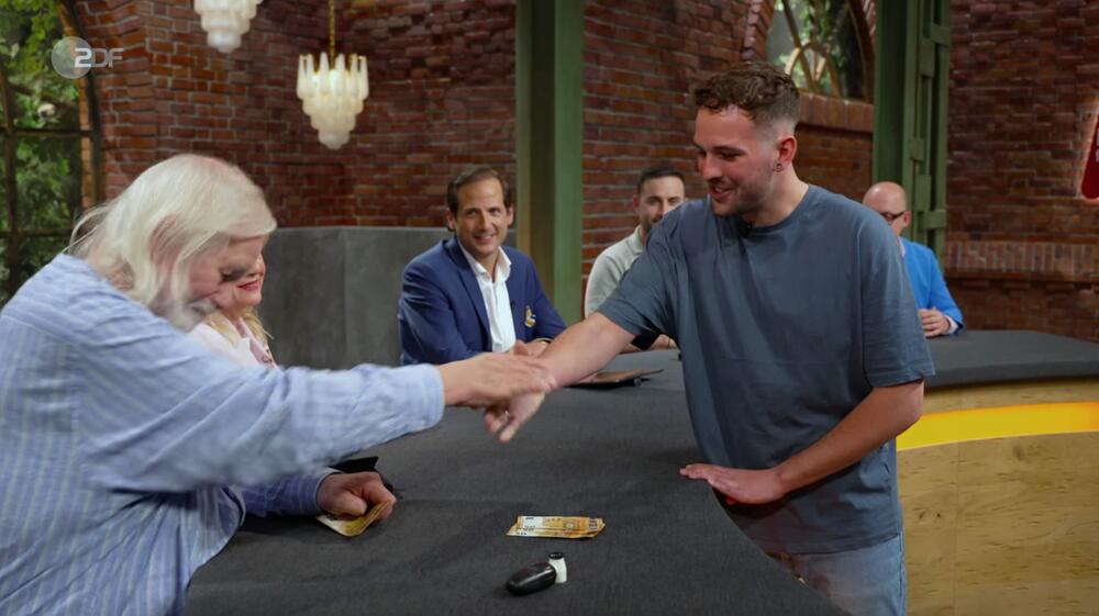 Steve Mandel ist nicht nur Antiquitätenhändler, sondern auch Musiker. So testet er gleich die Konzertina und entlockt ihr tatsächlich ganz passable Töne. Dafür erhält er sogar Applaus von seinen Kollegen. "Bravo", ruft Elke Velten, Benjamin Leo Leo ist ganz angetan von dem "Wahnsinn" und Julian Schmitz-Avila ruft sogar "Ich liebe dich" in den Raum.