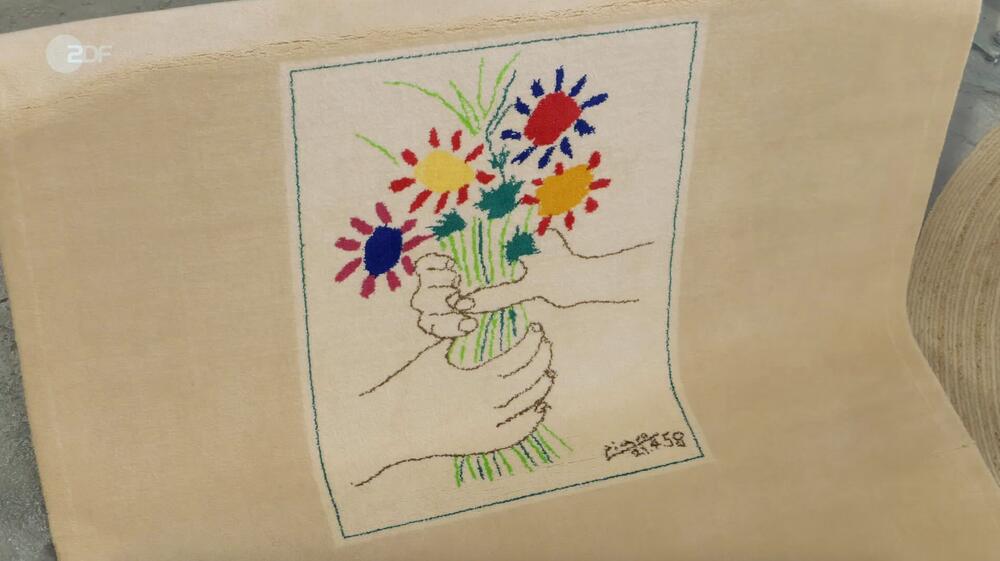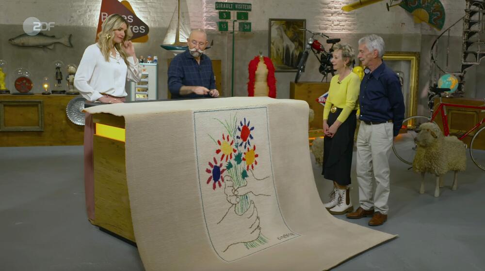 Abgebildet ist ein Motiv nach Pablo Picasso ("Le Bouquet", 1958) und die Stückzahl des limitierten Objekts liegt bei 500. Leider ist ein Riss im Teppich, der mit einem Cuttermesser damals beim Auspacken passiert ist. Dennoch liegt der Wunschpreis bei 500 bis 800 Euro.