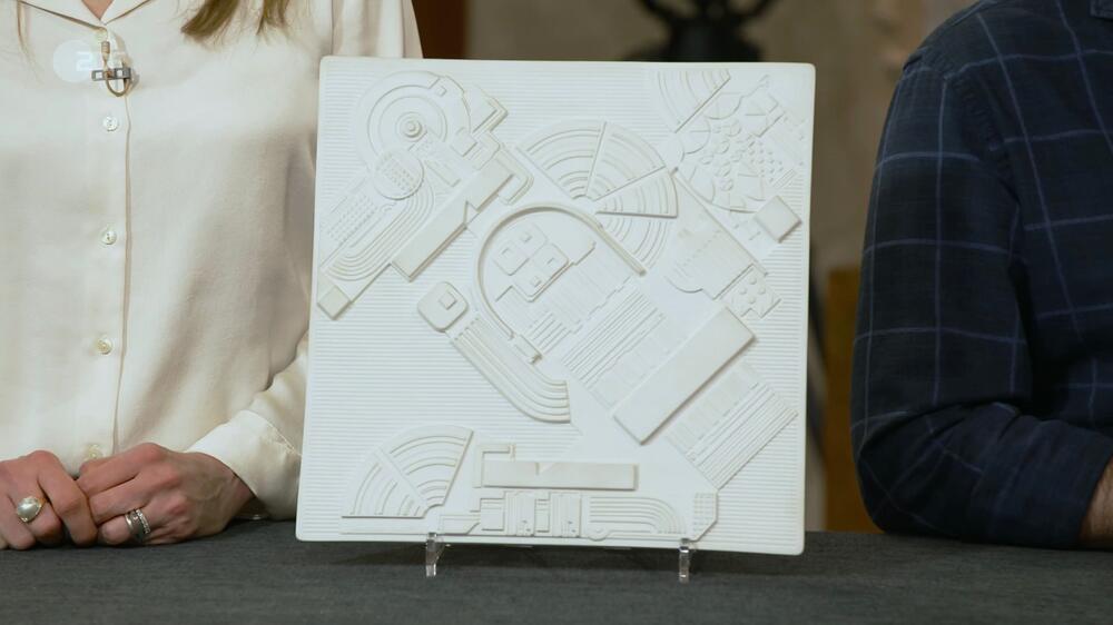 Mara und Rainer aus Mülheim an der Ruhr haben einen Reliefteller dabei, den sie auf dem Dachboden im Haus des Onkels entdeckt haben. Laut Bianca Berding stammt der Wandteller aus Biskuitporzellan von dem schottischen Grafiker und Bildhauer Eduardo Paolozzi.