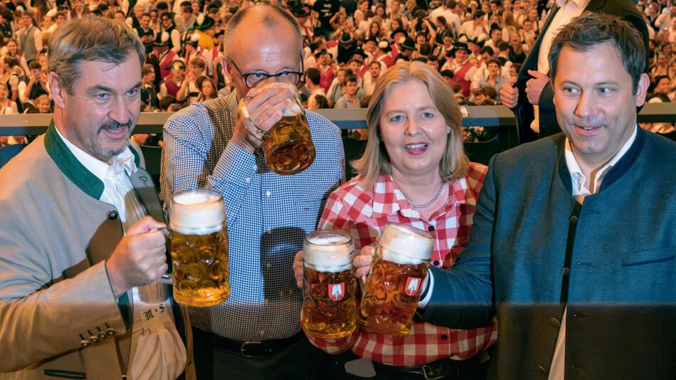 Gemeinsam mit Söder, Bas und Klingbeil zeigte sich der Kanzler gut gelaunt im Schottenhamel-Zelt. Es gab Jubel und Buh-Rufe.