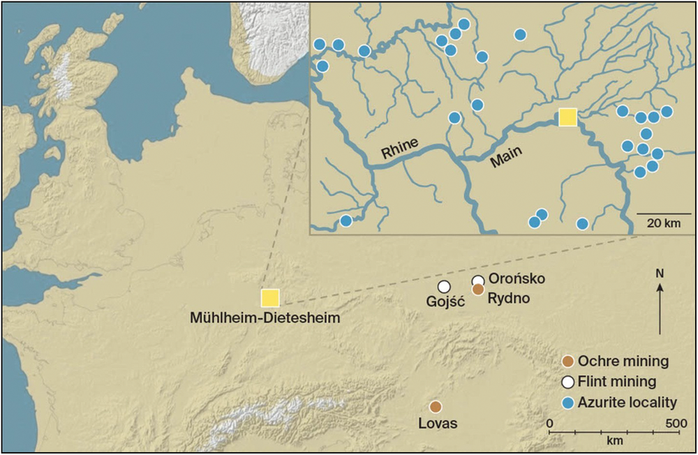 Ein Forschungsteam der Universität Aarhus in Dänemark hat in der hessischen Gemeinde Mühlheim-Dietesheim einen archäologischen Sensationsfund gemacht: Die Wissenschaftler entdeckten auf einem steinzeitlichen Fundstück Reste des blauen Minerals Azurit, die rund 13.000 Jahre alt sind. Dabei handelt es sich um den europaweit ältesten Nachweis für die Verwendung blauer Pigmente.