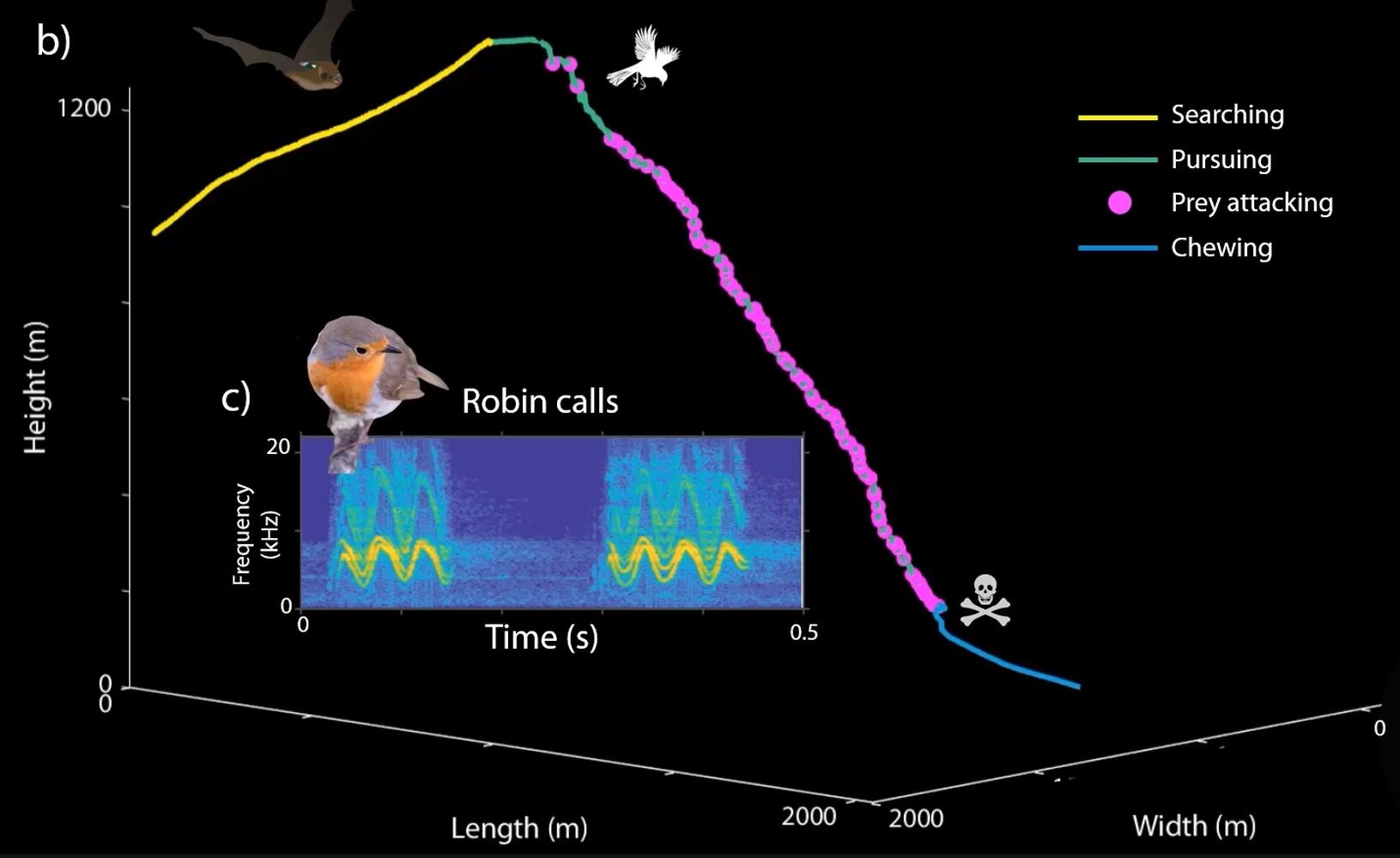 Das Mikrofon des Biologgers habe 19 Rufe des verfolgten Vogels aufgezeichnet, gefolgt von 23 Minuten deutlich vernehmbaren Kaugeräuschen der Fledermaus, die noch immer in geringer Höhe geflogen sei, so die Forschenden. Außerdem wurden unter den Jagdgebieten der Fledermäuse Flügel von Singvögeln gefunden, die das Team mit Röntgen- und DNA-Analysen untersuchte.